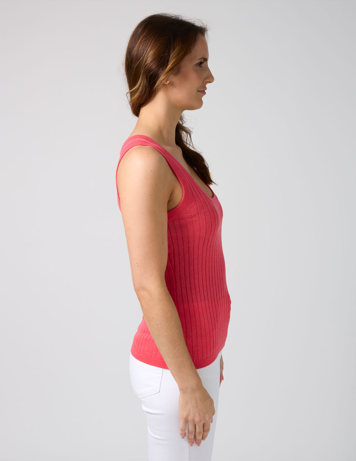 This fitted tank features a flattering scoop neck neckline and is crafted from a comfortable, flexible wide rib knit. Perfect for tucking into high-waisted skirts or pairing with linen trousers, this tank is designed to be a stylish, versatile layering piece or worn beautifully on its own.