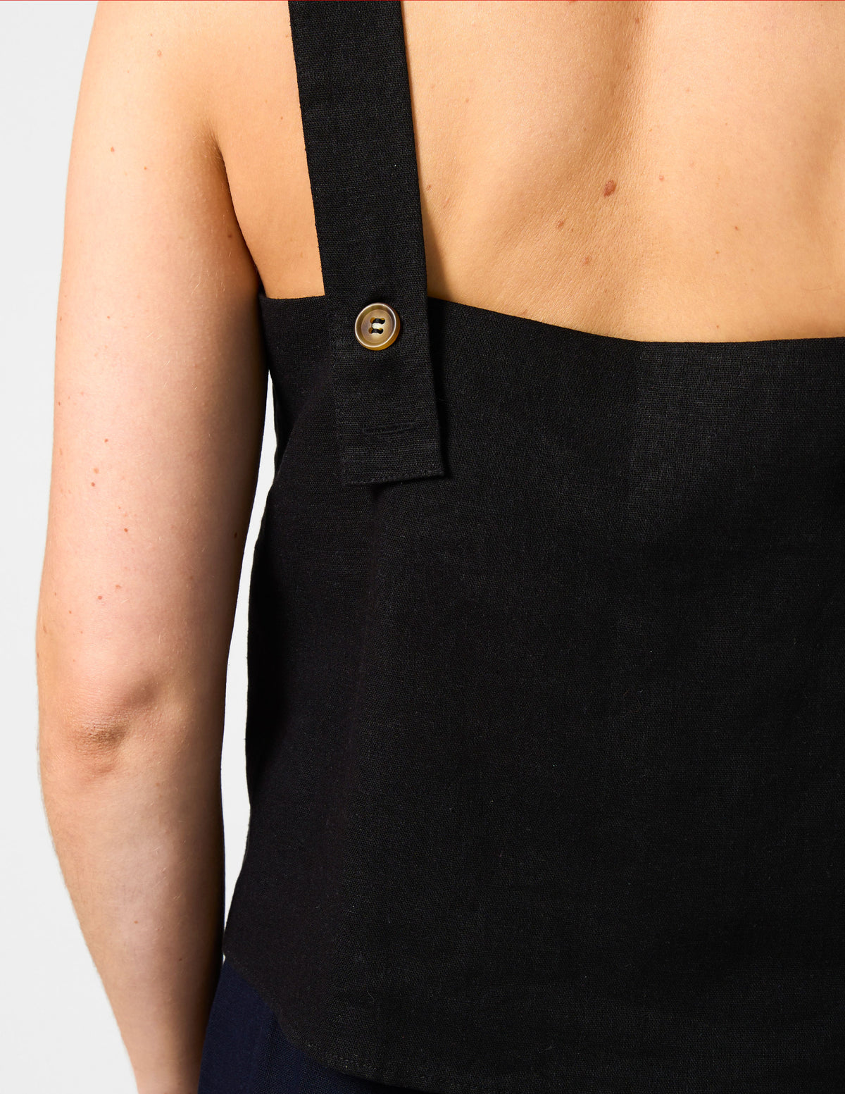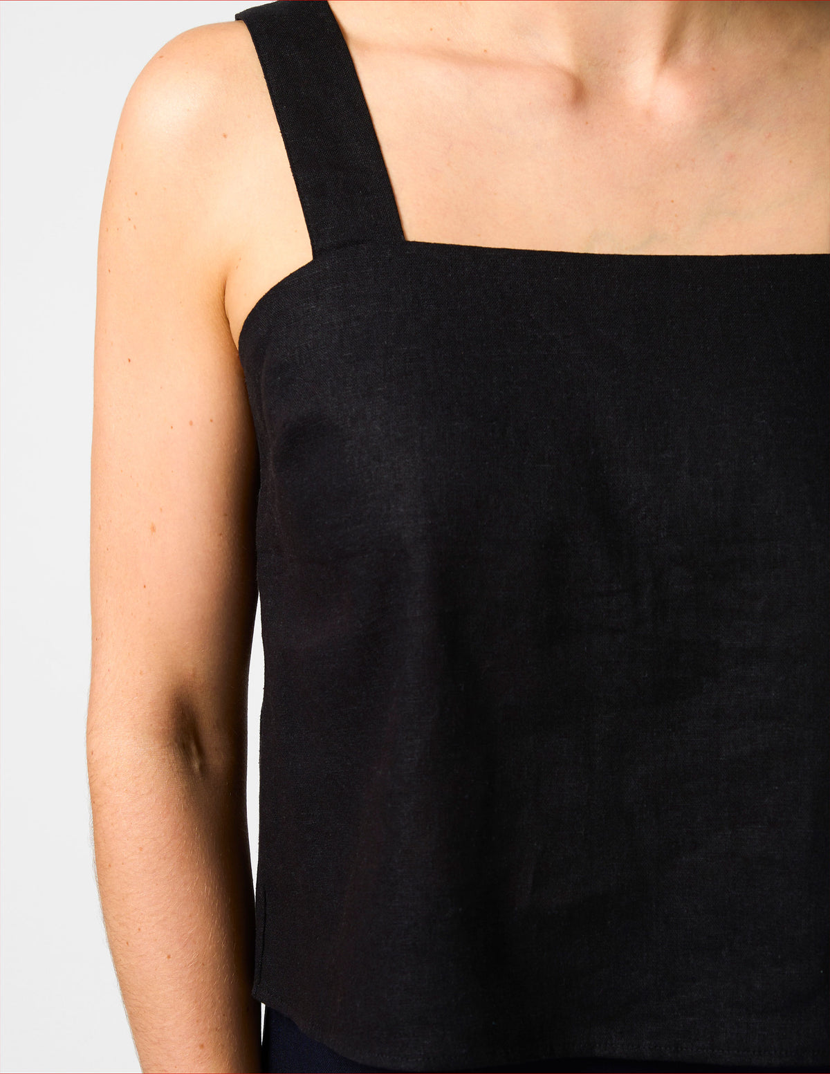 The Leonie Top in classic Black is designed to be a sophisticated and versatile staple in your wardrobe. This waist-length top is defined by its chic squared neckline and comfortable wide straps, offering a flattering, polished silhouette.