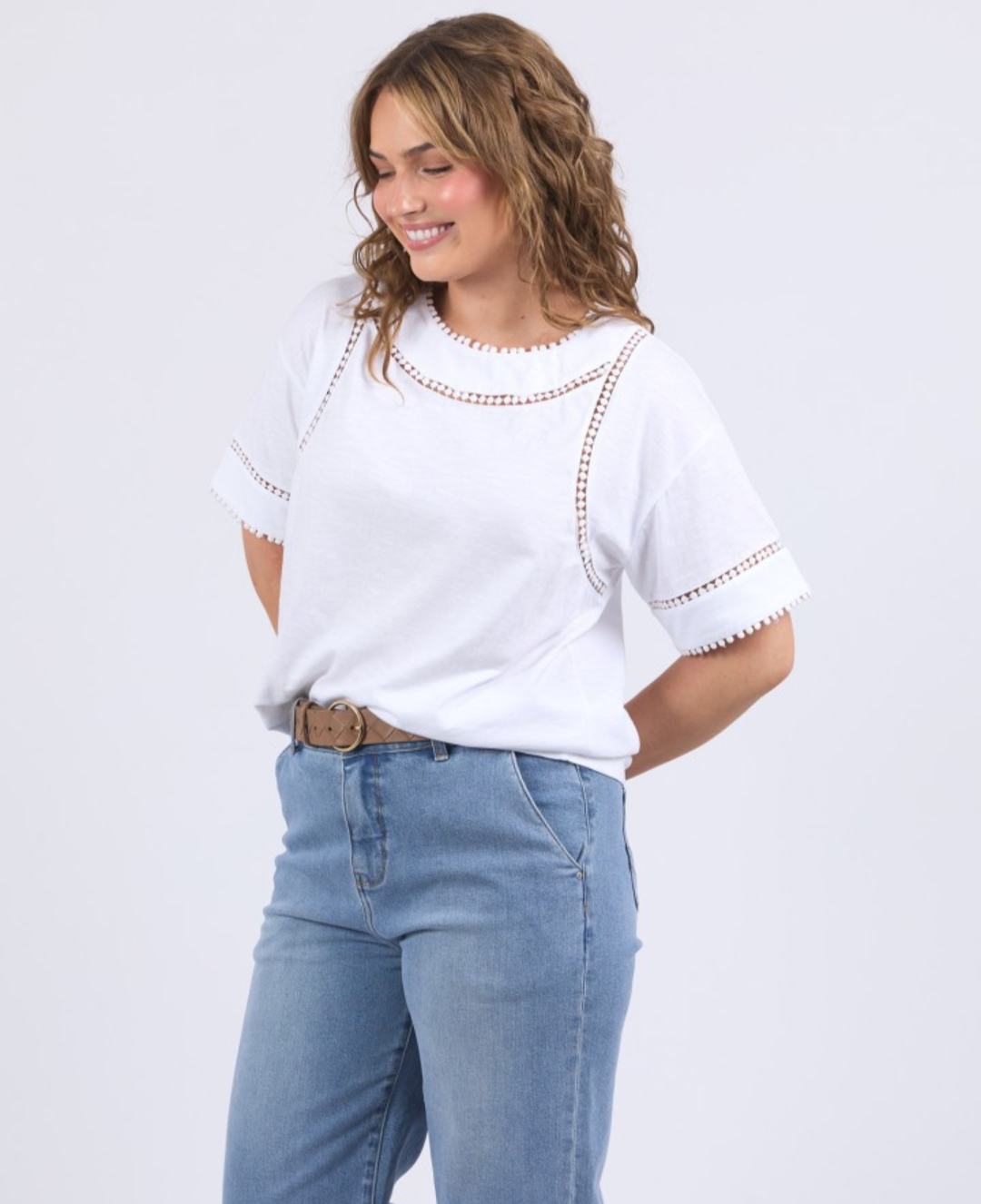 The top features a comfortable relaxed fit and is elevated by delicate Pom Pom detail at the edges, transforming it from a simple tee into a dressy T-shirt staple. It's the perfect top to pair with denim for a chic, easy look.