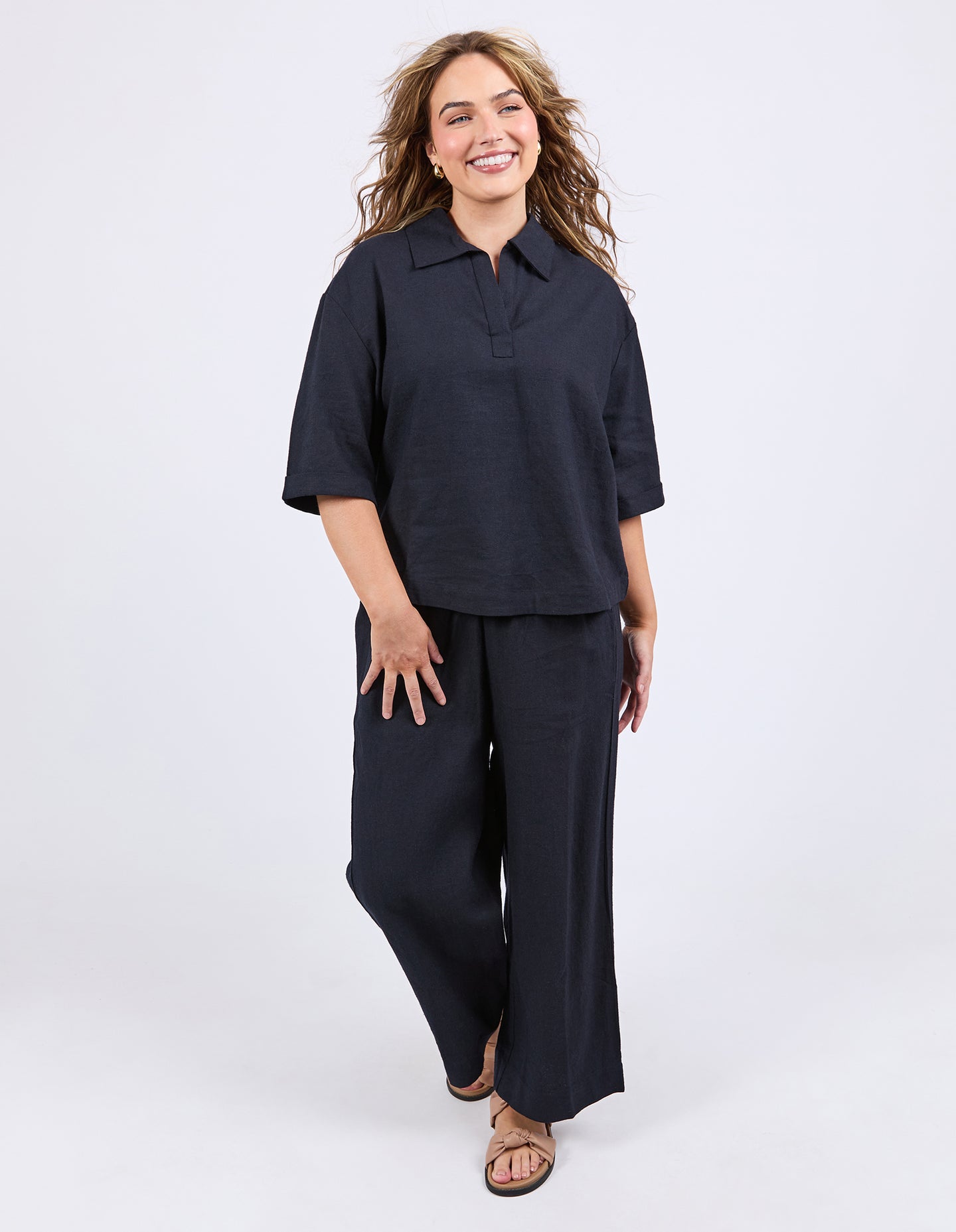 Crafted from a breathable Linen Viscose blend, this shirt offers a beautiful drape and comfortable, relaxed fit. It features a modern half open placket, making it easy to slip on and providing a chic, casual neckline. The Jamila Shirt works for any day of the week—simply style it your way for an instantly put-together look.