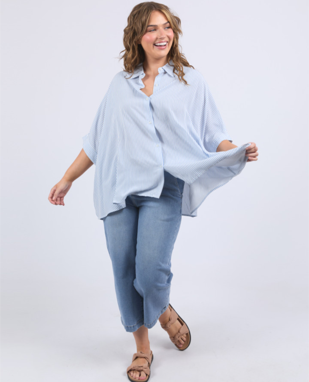 Introducing the Luna Shirt in a beautiful Dusk Blue and White Stripe, designed for an effortless look that works for any day of the week.