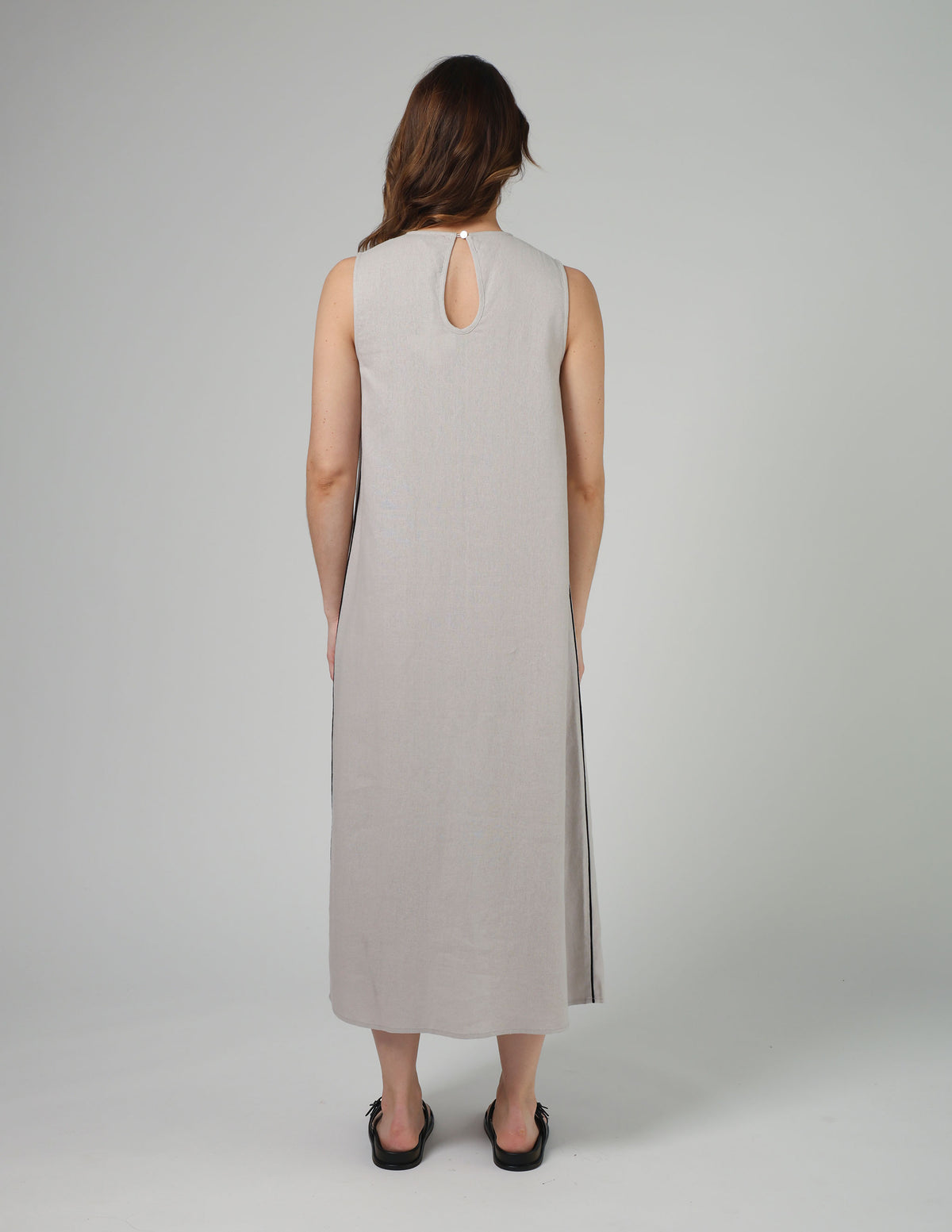 The dress is subtly elevated with a sophisticated side panel contrast piping detail that adds structure and interest. A delicate back keyhole opening finished with a chic gold logo button fastening completes this refined, essential piece.